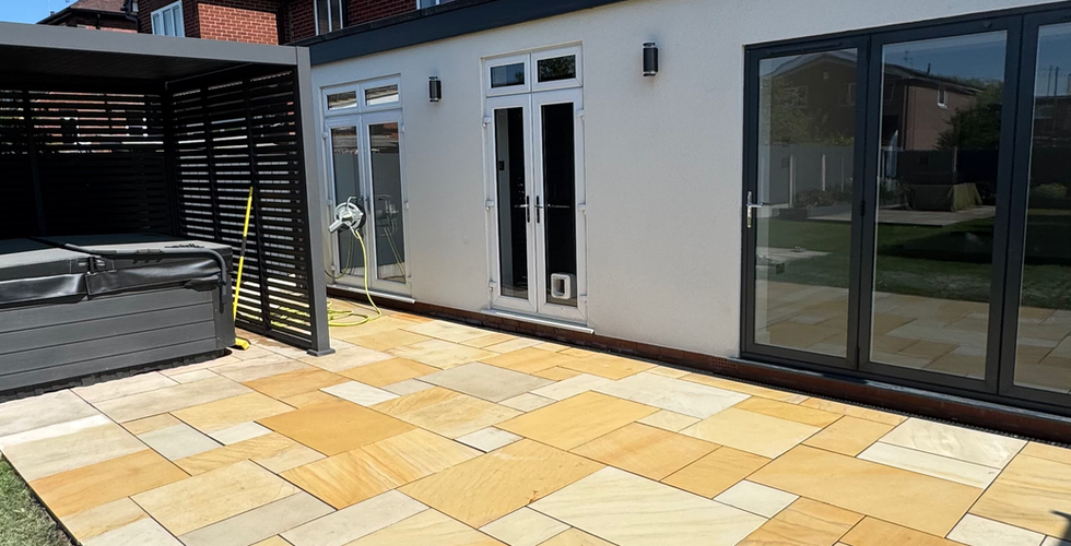 This garden in Walton, Stone (ST15) was transformed with a natural sandstone-effect porcelain patio, combining the warm tones of traditional stone with the strength and low-maintenance benefits of porcelain.
